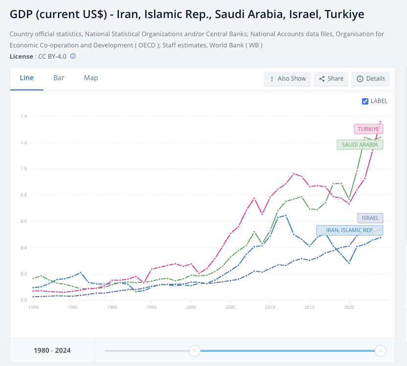 To add insult to injury, this economic collapse comes less than a year after Iran was humiliated in a brief and ultimately one-sided war with Israel. What was the point of the decades of inflation and sanctions and international isolation if Iran does not have a security force capable of defending the country or a nuclear deterrent capable of preventing Israel, the U.S., or anyone else from attacking Iran directly?