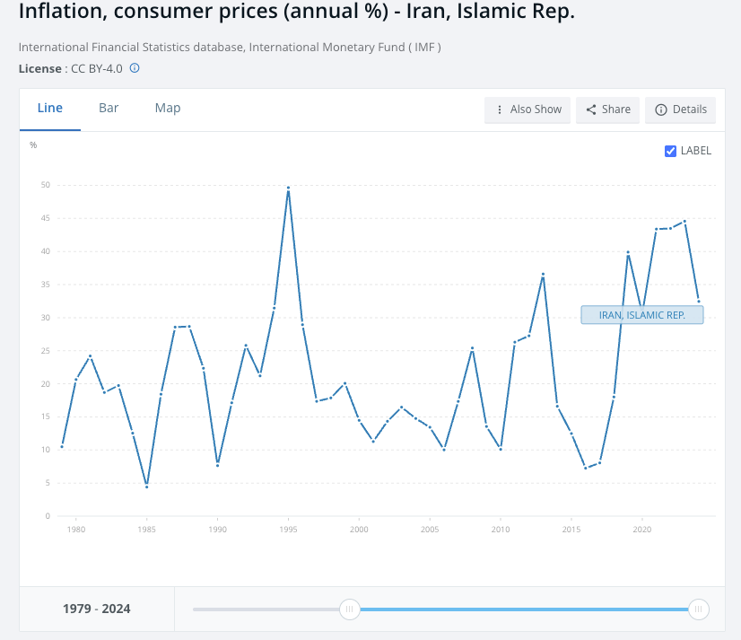 Low oil prices matter, but mostly as an accelerant rather than the root cause. Lower prices hit Iran harder than most producers because it can’t borrow, hedge, or attract capital to smooth revenue shocks, forcing greater reliance on money printing to fund rising security costs and subsidies. That feeds inflation and further weakens the currency.
