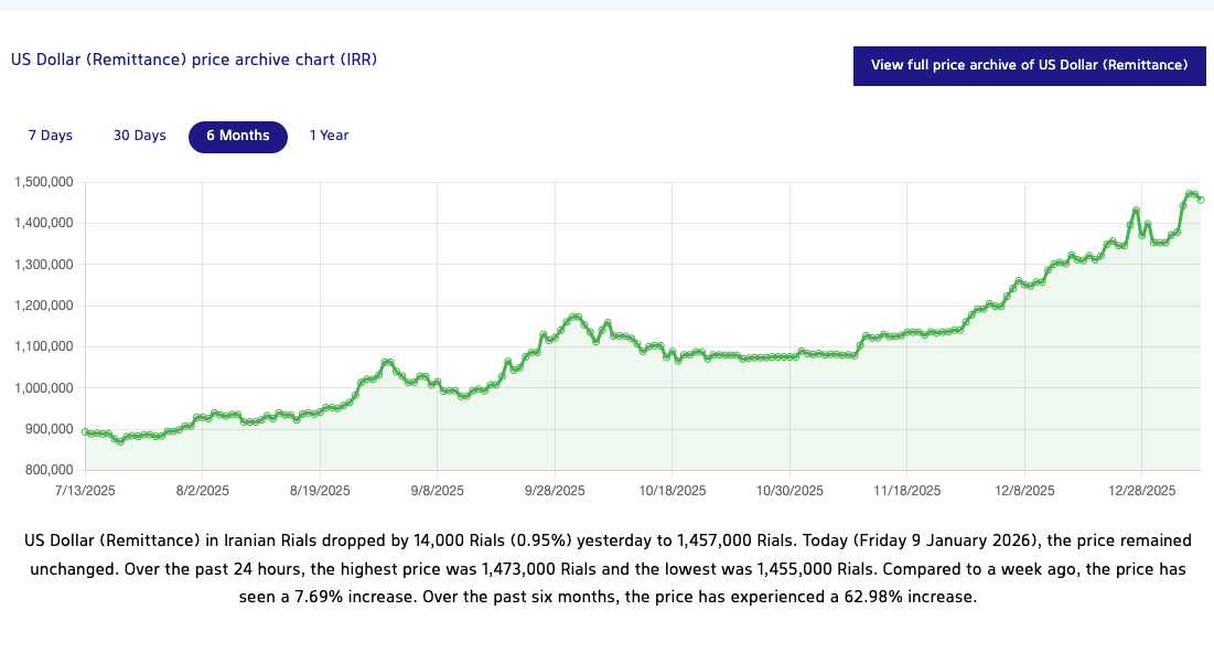 On December 19th, the Iranian government introduced a new pricing tier for gasoline (Iran heavily subsidizes the price of gasoline for the public).1 The last time the Iranian government hiked prices in 2019, it sparked nationwide protests and a subsequent violent security crackdown in which hundreds died. It took nine days for history to repeat itself: Protests in Tehran broke out in December 28th after the Iranian rial plunged to a record low of 1.42 million to the dollar, and the following day unrest spread to other major cities including Isfahan, Shiraz, and Mashhad. Neither the rial’s collapse nor the unrest have abated.