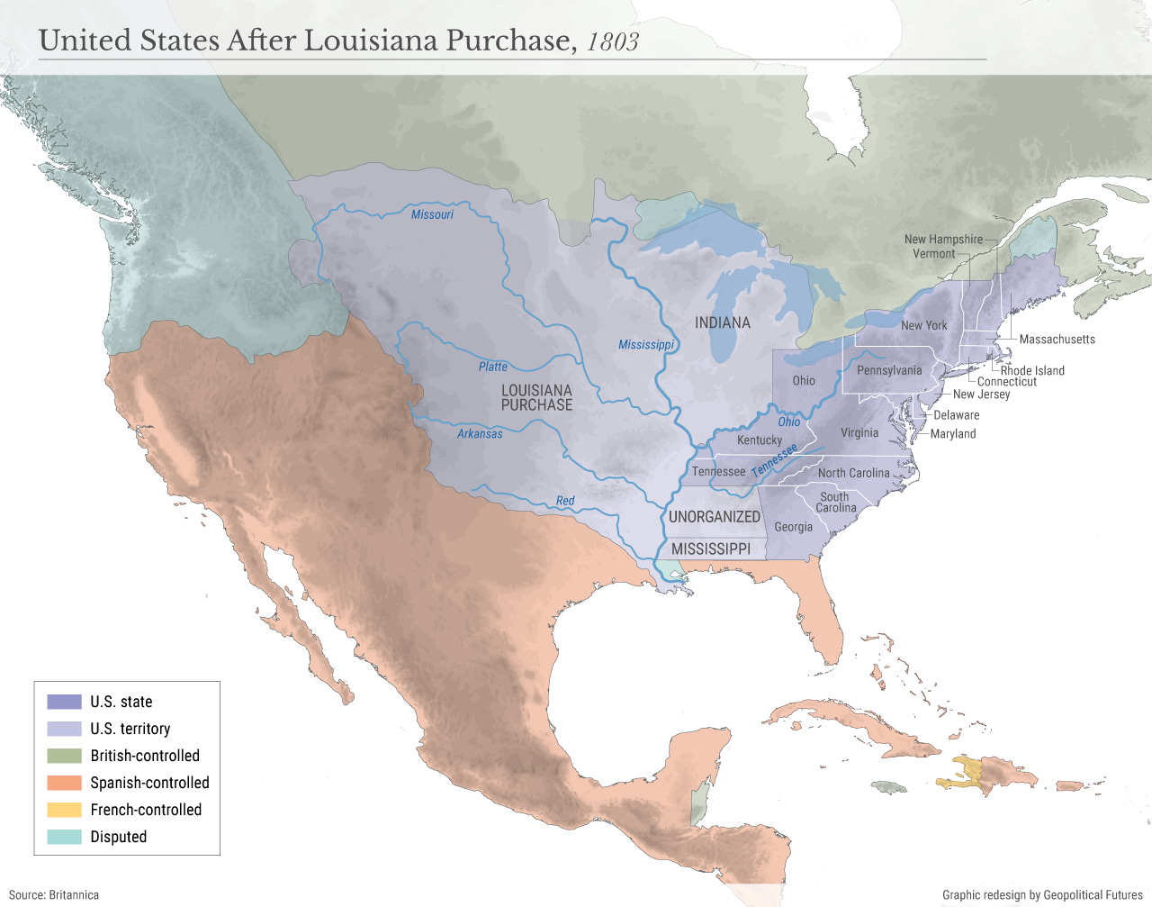 Arguably the most significant geopolitical move in U.S. history was the Louisiana Purchase. For $15 million (that’s roughly $450 million in present day dollars),20 the size of the fledgling United Staes was doubled overnight. Not only that, but the U.S. acquired the entirety of the Mississippi River’s drainage basin and the critical Mississippi River port of New Orleans. Then-President Thomas Jefferson had long been eager to acquire Louisiana — and European geopolitics gave him the opportunity to do so.
