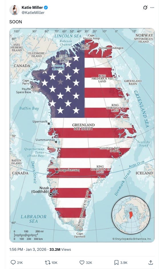 In my last post, I suggested that Venezuela was an appetizer and that Cuba was the main course. As it turns out, Venezuela might have been the amuse-bouche for this New American Empire. Greenland might be on deck as the appetizer.