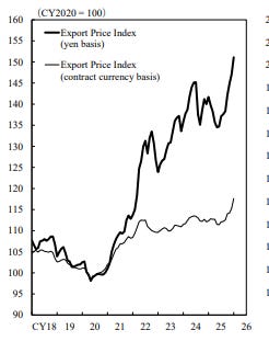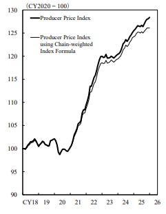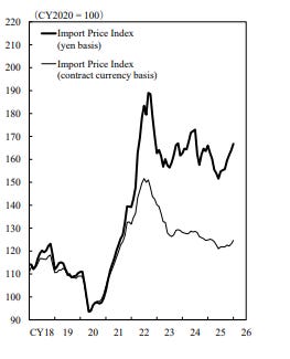 Moreover, the recent trend in inflation is not encouraging. Below are three charts from the latest Bank of Japan release. The first shows the producer price index (2020 = 100). You don’t need to be an economist to see the step change over the past five years — input costs for Japanese producers have climbed meaningfully. Next is the export price index. This is the weak yen doing what a weak yen is supposed to do: boosting the competitiveness of Japanese exports and lifting export prices in yen terms. But the third chart matters more for Takaichi’s political reality: the import price index. Whatever exporters gain from currency weakness is offset — and in some cases overwhelmed — by higher import costs for energy, food, and industrial inputs. Takaichi was not elected by firms benefiting from a favorable currency tailwind; she was elected by households and small businesses feeling the squeeze from rising import prices.