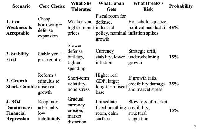 Weighing these balancing forces, I made a little chart with the help of ChatGPT on the potential scenarios going forward for Takaichi. I’ve also ascribed rough probabilities to each scenario. My base case11 is that Takaichi will accept yen weakness to achieve cheap borrowing rates and higher growth/defense spending.