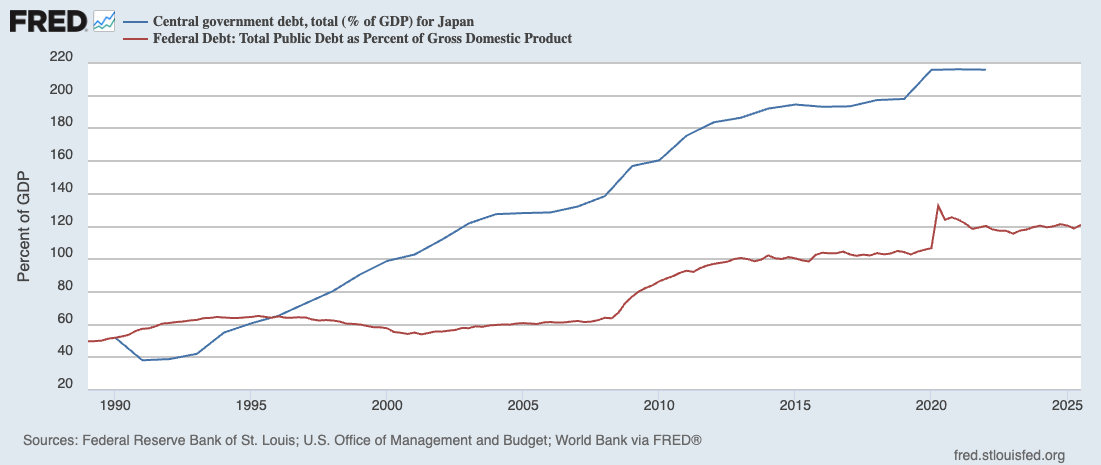 Cheap government borrowing. This is effectively maintaining the status quo. Since the 1990s asset bubble collapse, Japan has lived in a world of low growth, low inflation, and persistent excess savings, the so-called “Lost Decade(s)”. That allowed the Bank of Japan to steadily cut rates to zero, then below zero, and eventually cap long-term yields through yield curve control. For much of the past decade, 10-year Japanese government bond yields hovered around 0% — sometimes even negative. This happened while Japan’s public debt climbed above a whopping 200 percent of GDP. Normally markets would demand higher yields to compensate for that risk. But because most of the debt is domestically held and because most countries in the West maintained low interest rates post-2008 financial crisis, inflation was subdued, and the Bank of Japan (BoJ) was willing to buy large amounts of bonds, borrowing stayed cheap.