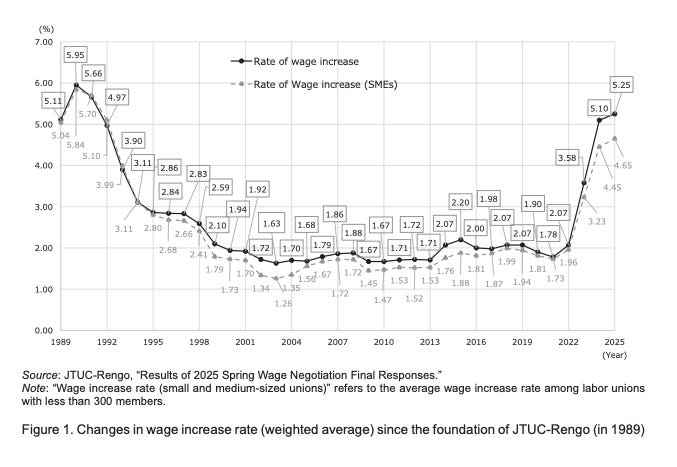 And unfortunately, the erosion of purchasing power is actually what has been happening in Japan. Beginning in 2022, nominal wage increases in Japan started to ascend, and for the last two years, the “Shuntō”, (春闘), literally “spring offensive,” has seen large firms agree to wage hikes above 5 percent. (The “Shuntō” is Japan’s annual spring wage negotiation cycle. Every year, major labor unions coordinate their wage demands and negotiate with employers around February–March. The outcomes set the tone for wage growth across the economy. Even though union membership in Japan is relatively low, Shuntō has outsized signaling power: when large firms agree to 4–5 percent wage hikes, smaller firms often follow, and markets treat the result as a benchmark for national wage momentum.)