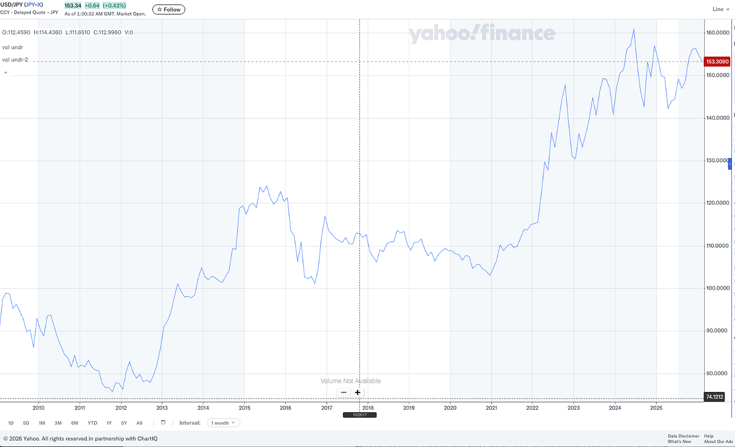 A stable and strong yen. Remember, Japan is a country that imports everything. A weak yen is good for Japanese exporters as it makes Japanese manufactured products more competitive in global markets, but a weak yen also means the purchasing power of the average Japanese citizen declines. In Japan, this is felt more deeply than it is in most countries and magnifies the pain of inflation. In recent years, the yen has been both volatile and weak — and in general has been in a steady weakening trend since 2012. The affordability crisis in Japan is what foiled her predecessors and is what led the electorate to be open to a change candidate with a confident vision of the future like Takaichi.
