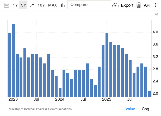 This path will not be easy, but I see it as the most probable because it is the path of least resistance and the one most consistent with success on her own terms. For it to work, cheap borrowing and pro-growth, pro-defense policies must translate into sustained wage gains. Japan’s headline inflation does not look alarming in isolation, but that misses the real constraint. A weaker yen, layered on top of inflation, becomes politically toxic if wages do not rise faster than prices. If purchasing power erodes, the entire strategy begins to unravel.